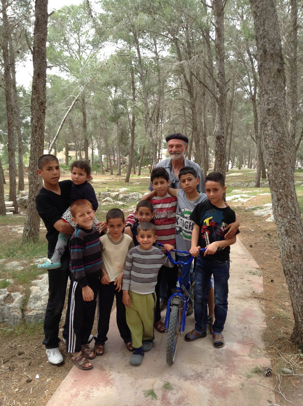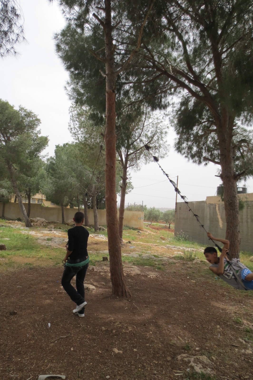 Yesterday we met with the Mayor and council of Jenin, a city that was severely damaged during a conflict with the Israeli army 6 years ago and had to rebuild. The city architect showed us a site in a beautiful hilltop wooded park overlooking the city where a bunch of kids were playing on dilapidated equipment. When asked where they lived they pointed to houses adjacent to the park. The oldest added that they were from Haifa where their grandparents lived before 1948.I then asked them where their favorite place was through Suhad, The TYO psychologist and our translator for the day. They pointed to a far corner of the park in the shadow of a concrete wall surrounding an Israeli military installation. (They occupy all of the heights above the cities.) We followed them, with me and the head kid in the lead, to a spot where they had strung up ropes and canvas belts high up in some trees and then gleefully demonstrated how they swung around the trunks like living tether balls.